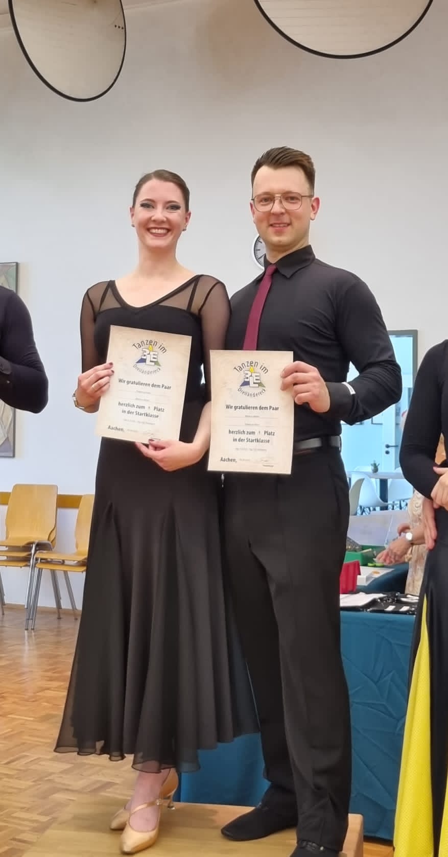Auch unsere beiden D-Klasse Paare Markus Malek und Rebecca Klein sowie Alexander Kober und Diana Bühren starteten in Aachen. Für Markus und Rebecca rieselte es Platzierungen in der Hauptgruppe I und II: 3. Platz am Samstag am Sonntag Platz 2 in Hauptgruppe I. Gekrönt wurde das Turnierwochenende für die beiden mit dem Sieg in Hauptgruppe II, wodurch sie anschließend in Hauptgruppe II in der C-Klasse starten durften. Auf dem Siegertreppchen direkt daneben durften sich Alexander Kober und Diana Bühren über Platz 2 am Sonntag in Hauptgruppe II freuen.