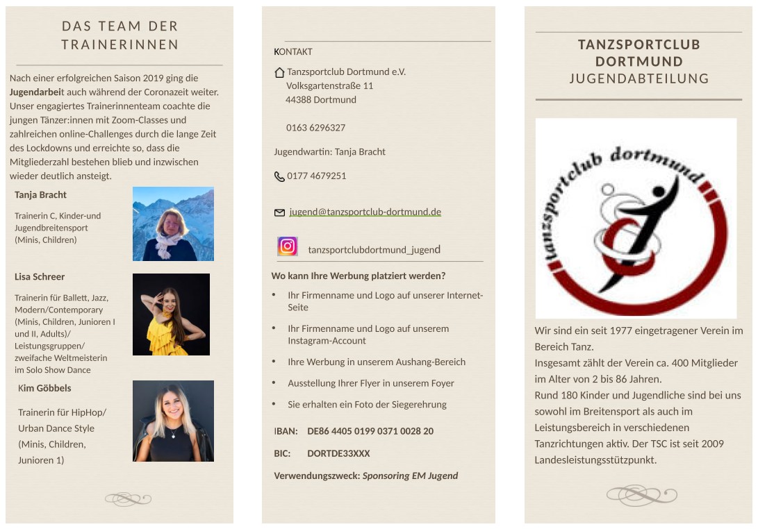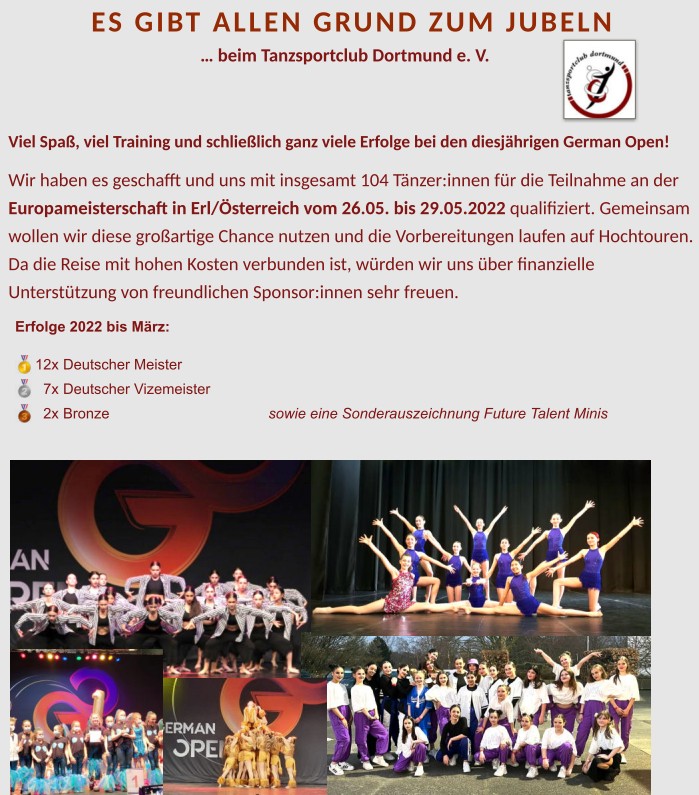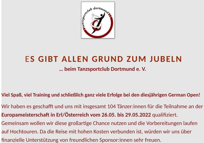die folgenden 4, durch anklicken sich öffnenden PDF-Dateien, informieren Sie ausführlich über das Sponsoring unserer, sich für die Europameisterschaft in Österreich qualifizierten Tänzerinnen.