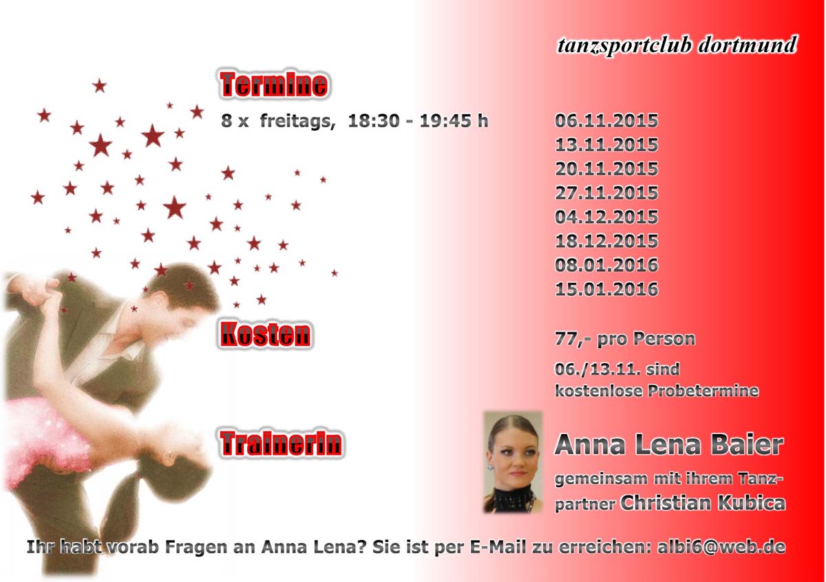 Unsere neue Gruppe für Paare bis 30, geleitet von Anna Lena Baier, gemeinsam mit ihrem Tanzpartner Christian Kubica, ist gestartet - ein Einstieg ist aber auch später noch möglich - alle Infos auf dem Flyer...