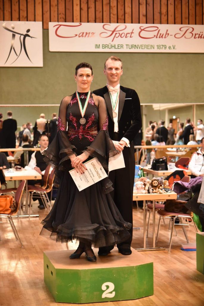 Martin Wiesner und Sandra Tchana Tchuinou starteten in der Hauptgruppe II D Standard. Im Feld von drei Paaren überzeugten die Beiden die Wertungsrichter und sind somit die Landesmeister 2021. Sandra schreibt: "Es waren leider nur 3 Paare am Start, aber wir haben uns trotzdem riesig gefreut nach 1,5 Jahren Turnierpause wegen Corona endlich wieder ein Turnier zu tanzen."