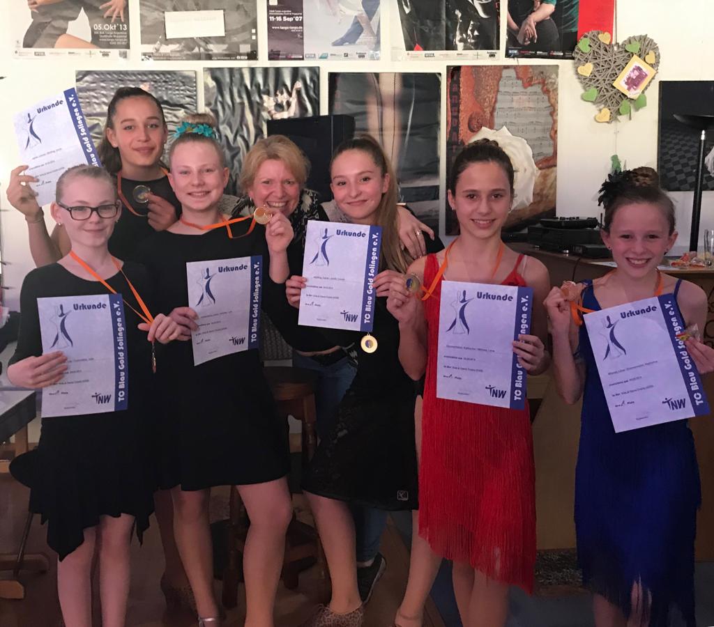 So fuhren heute unsere 6 Breitensport-Mädels zum TC Blau Gold Solingen. Gut motiviert gingen unsere 3 Paare an den Start, als erstes wurde der Pflichttanz Cha Cha Cha getanzt, daraufhin folgten drei Wahltänze. Katharina und Lena, so wie auch Julia und Lea wählten die Tänze Samba, Rumba und Jive, wohingegen Leonie und Jamie ihren Lieblingstanz Paso Doble tanzten.