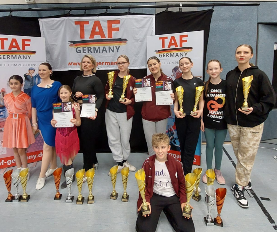 Am Sonntag den 5. Mai 2024 ging es für zehn unserer Tänzer:innen mit Trainerin Tanja Bracht in die Schlosswallhalle Osnabrück zum offenen Deutschland Cup Latin Solo Style des Tanzsportverband TAF Germany. Für 9 unserer 10 Starter:innen war es das allererste Latein Turnier, entsprechend groß waren Aufregung und Nervosität. Beim offenen Turnier in Osnabrück konnten sich die Teilnehmer:innen vorher aussuchen, ob sie in allen 5 Tänzen antreten oder nur in einem oder in den jeweiligen Lieblings- Tänzen. Je Tanz wurden die Alterskategorien Kinder (8-12 Jahre, Jahrgang 2012 oder später), Junioren (13-16 bis Jahre, Jahrgang 2008-2011), Erwachsene 1 (17-30 Jahre, Jahrgang 2007 oder früher) und Erwachsene 2 (ab 31 Jahre, Jahrgang 1993 oder früher) unterschieden und jeweils Boys und Girls getrennt gewertet. Wie im klassischen Latein wurden alle Tänze zunächst in der sogenannten Sichtungsrunde mit allen Teilnehmenden in den jeweiligen Altersgruppen getanzt, dabei gab es die Möglichkeit Solo, Synchro Duo, als Gruppe oder Formation anzutreten. Alle unsere Tänzer:innen traten als Solo-Tänzerinnen an, 2 unserer Juniorinnen tanzten außerdem 4 von 5 Tänzen zusätzlich synchron im Duo. Alle unsere Teilnehmer:innen durften dann in den Endrunden ihr Können erneut unter Beweis stellen, diesmal mit bis zu 3 Runden á 1 Minute je Tanz bei Startfeldern von 4 oder mehr Teilnehmer:innen.