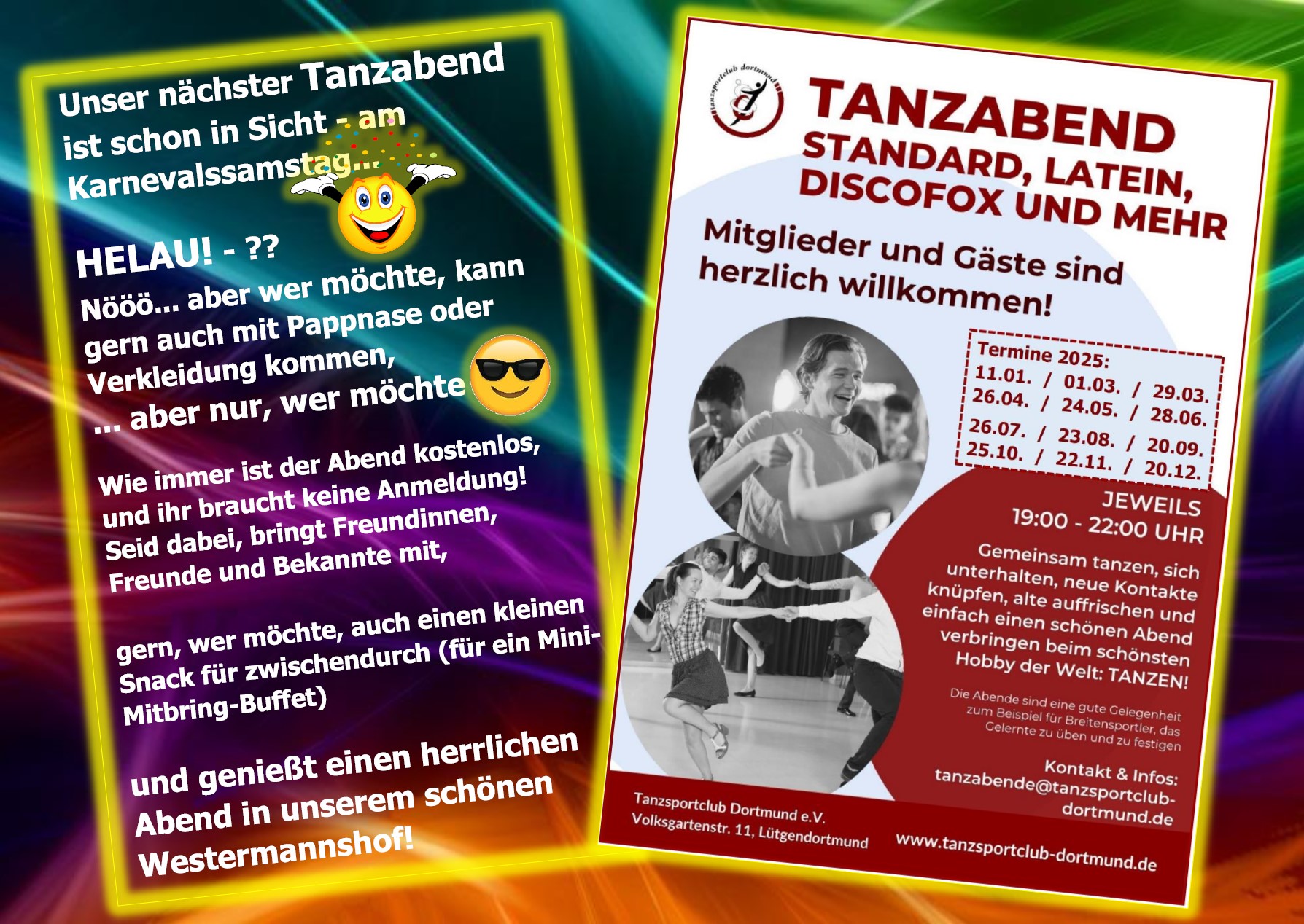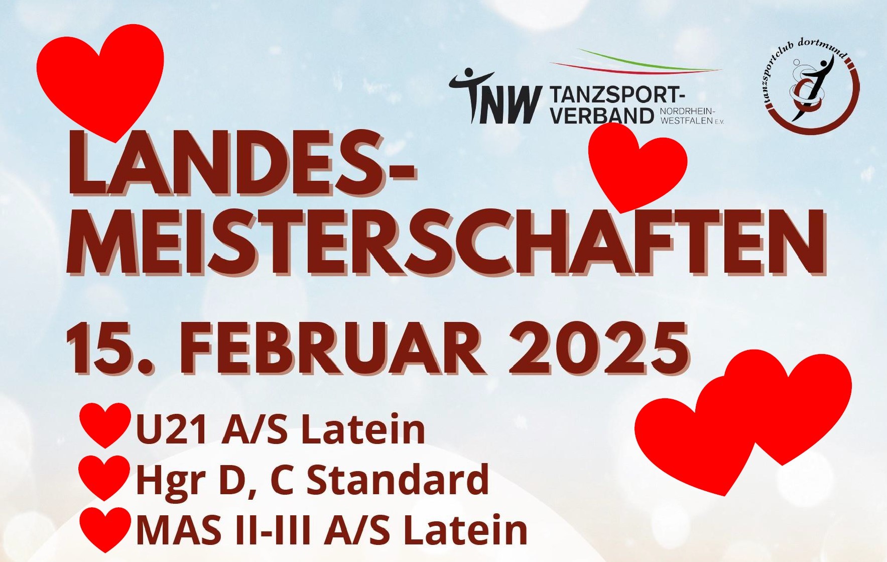 Am 15. Februar 2025 war der Tanzsportclub Dortmund Ausrichter der Landesmeisterschaften in mehreren Standard- und Lateinklassen und empfing zahlreiche Tanzpaare und Gäste noch in Valentinsstimmung - unzählige Herzchen bestimmten die Tischdekoration...