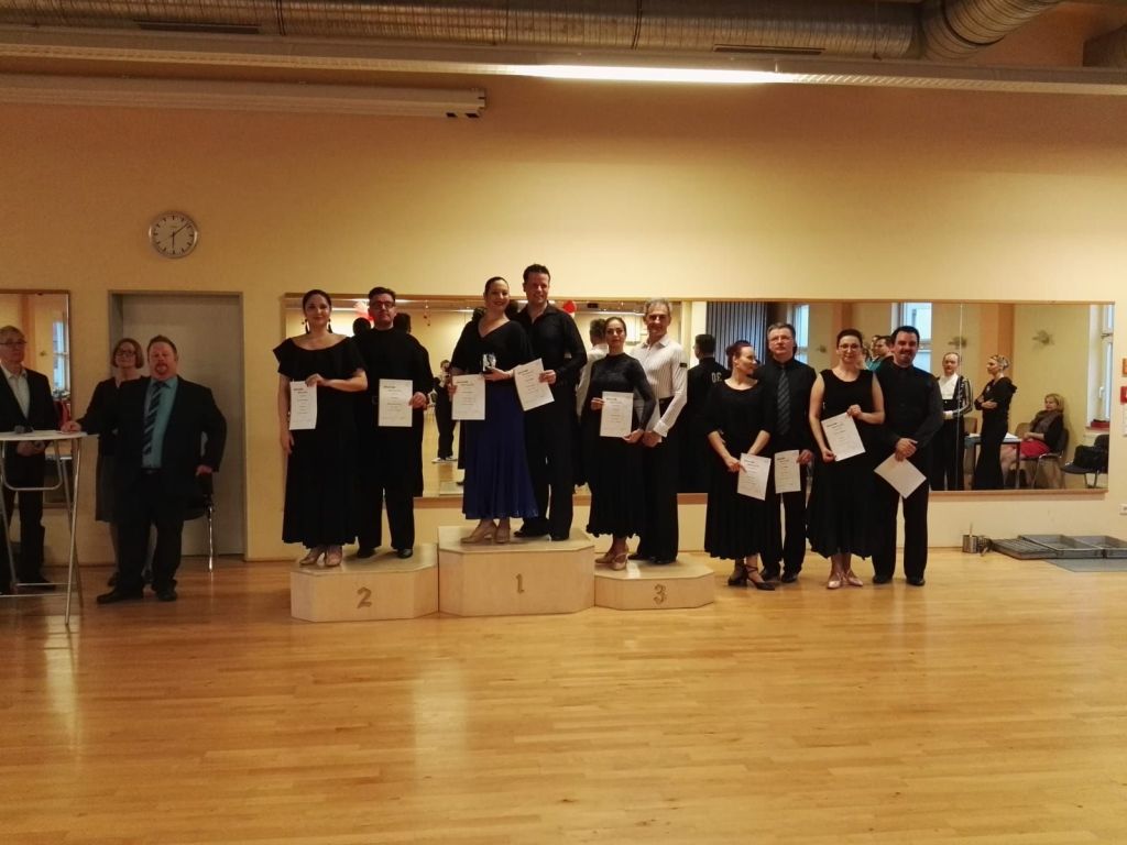 Auf dem obersten Treppchen stand ebenfalls am Samstag ein weiteres Paar unseres Clubs: Christian Kraus und Jessica Depta wurden Erste im Turnier der Hauptgruppe II A Standard. Christian und Laura tanzten als Siegerpaar mit und wurden Zweite. Auch hier waren drei Paare am Start.