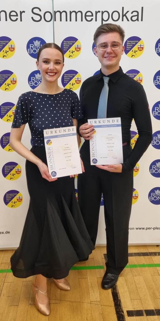 Beginnen wir mal mit unseren Senkrechtstartern Nr. 1, ANDRÉ / LENA, die in ihrem erst dritten Turnier das zweite Mal einen Treppchenplatz ertanzten - und das in einem richtig großen Starterfeld von 20 Paaren (!!) der HGR D Std. - Nach sehr überzeugend getanzter Vor- und Zwischen-runde zogen sie klar ins Finale ein und versüßten sich ihren 3. Platz mit dem 2. im Langsamen Walzer - super!!