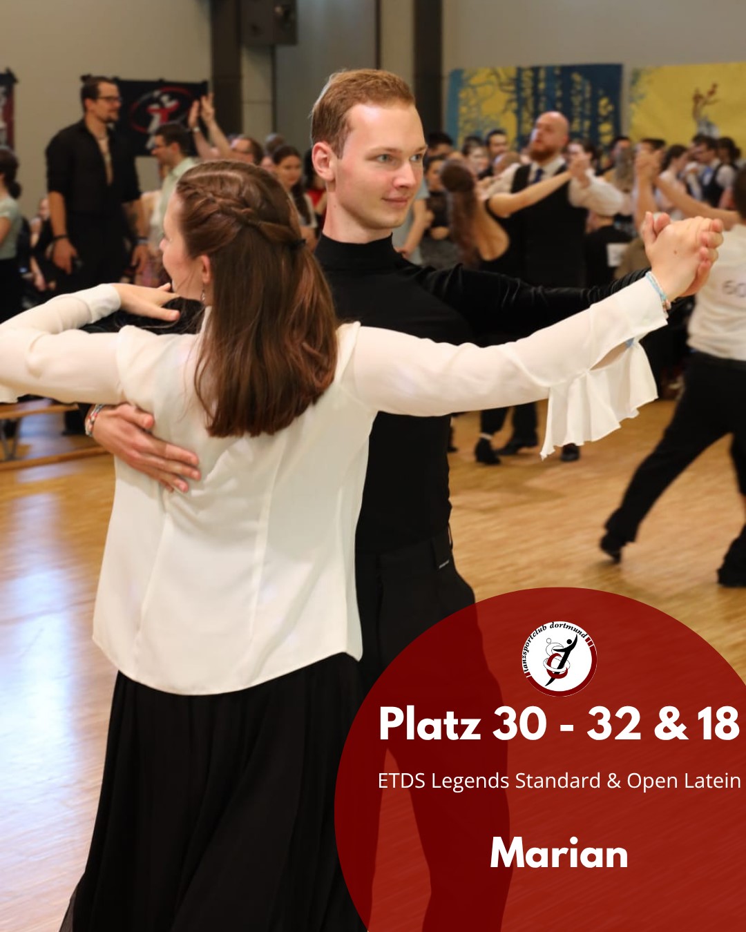 Das riesige Teilnehmerfeld wurde jeweils in 6 Kategorien (Enthusiasts, Amateurs, Professionals, Masters, Champions und Legends) unterteilt. Etwas fürs Auge war ebenfalls dabei, denn in der Open-Class, der höchsten Kategorie des Turniers traten hochklassige Turnier-Tänzer*innen gegeneinander an. Auch Marian (Latein D-Klasse) hat dieses starke Feld erreicht - Herzlichen Glückwunsch!