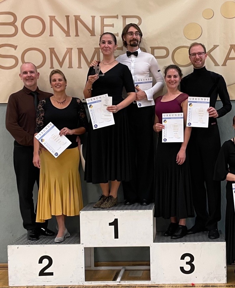 Weiter geht's mit Senkrechtstartern Nr. 2: ROBERT /MYRIAM, die in Bonn gleich drei Mal an den Start gingen: Auch in kleinen Startfeldern ist es nicht einfach, sich zu behaupten, aber es gelang ihnen bestens: Bei sehr gemischten Finalwertungen ertanzten sie sich zwei 3. Plätze in der Mas I D Standard (von 4 bzw. 5 Paaren); am Sonntag teilten sie sich Platz 1 im Tango mit den Turniersiegern - wow! Dazu wurden sie 5. im 10-paarigen Feld der HGR II D - klasse!